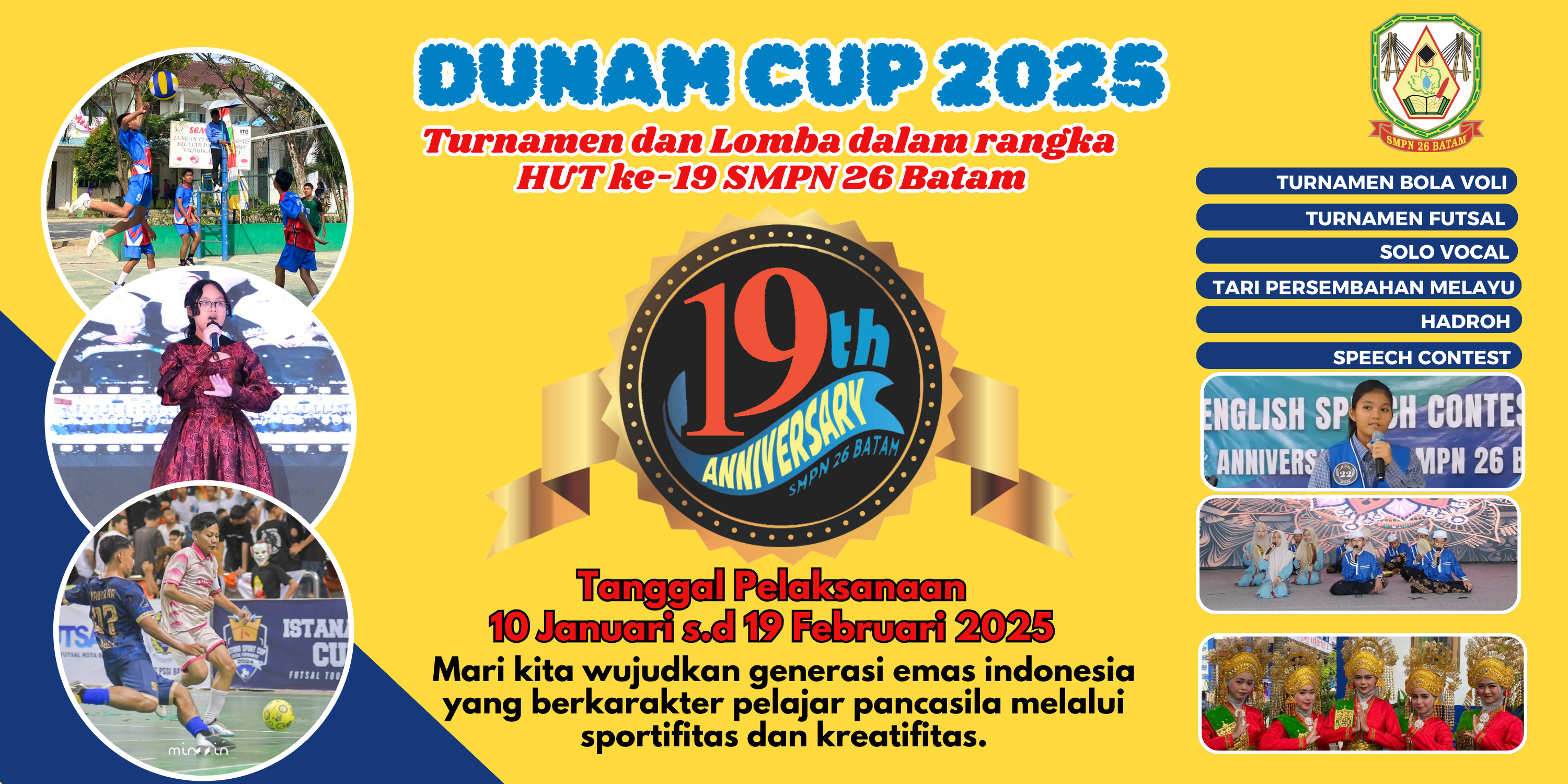 Assalamu'alaikum Wr. Wb.Berkenaan dengan Ulang Tahun ke-20 SMPN 26 Batam, kami mengundang seluruh pelajar/perwakilan sekolah untuk berpartisipasi dalam DUNAM CUP 2026. Lebih dari sekada